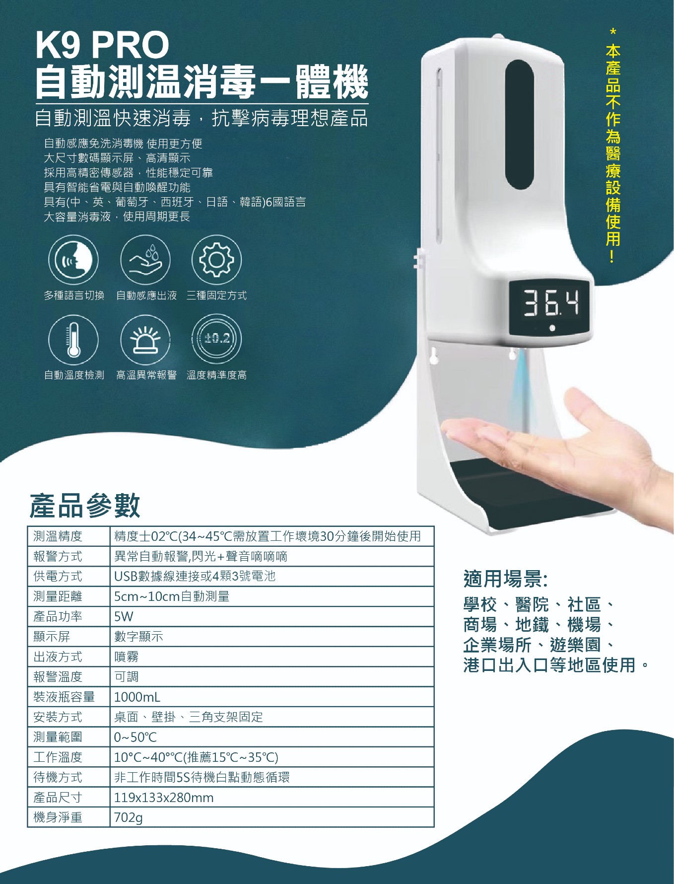■供電來源可選擇使用電池或USB傳輸線 ■壁掛/桌放/立架(選配)三種安裝方式,讓您走到哪用到哪 ■自動測溫感應消毒,減少接觸感染機率,防護更加倍 ■紅外側溫搭配自動警報裝置,時時為您的健康狀態把關 ■支援五種語言的語音功能,讓防疫不再因語言出現距離 ■本商品不含消毒液體