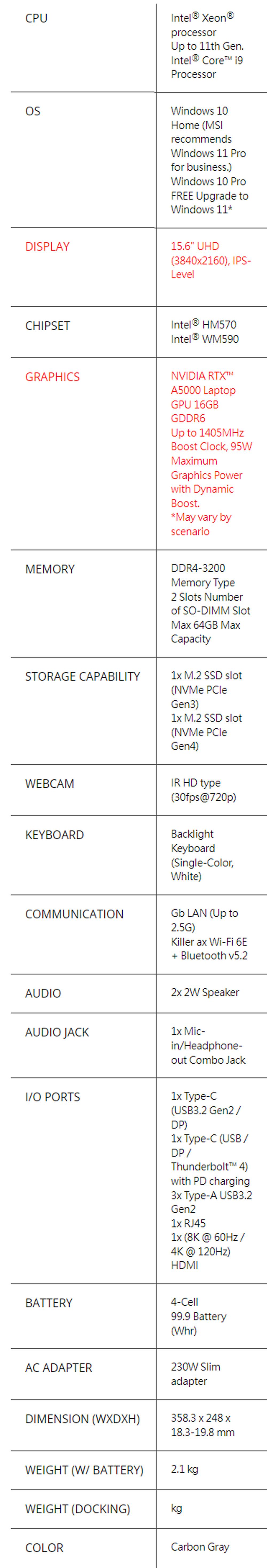 螢幕:15.6" UHD, IPS-Level ● 處理器:Intel® Core™ i9-11900H ● 顯示卡:NVIDIA RTX™ A5000 16G ● 記憶體:32G DDR4 ● 儲存空間:1TB PCIe SSD ● 作業系統:Windows 10 Pro 品 牌:MSI 原廠型號: MSI WS66 11UM-610TW-GG91190H32GXXDX10PH ※以上規格資料若有任何錯誤,以原廠所公佈資料為準。