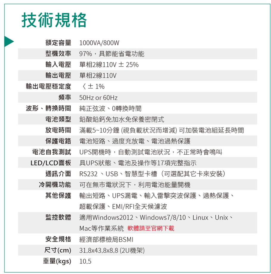 110V 1KVA機架式, 2U (節能ECO高效設計)