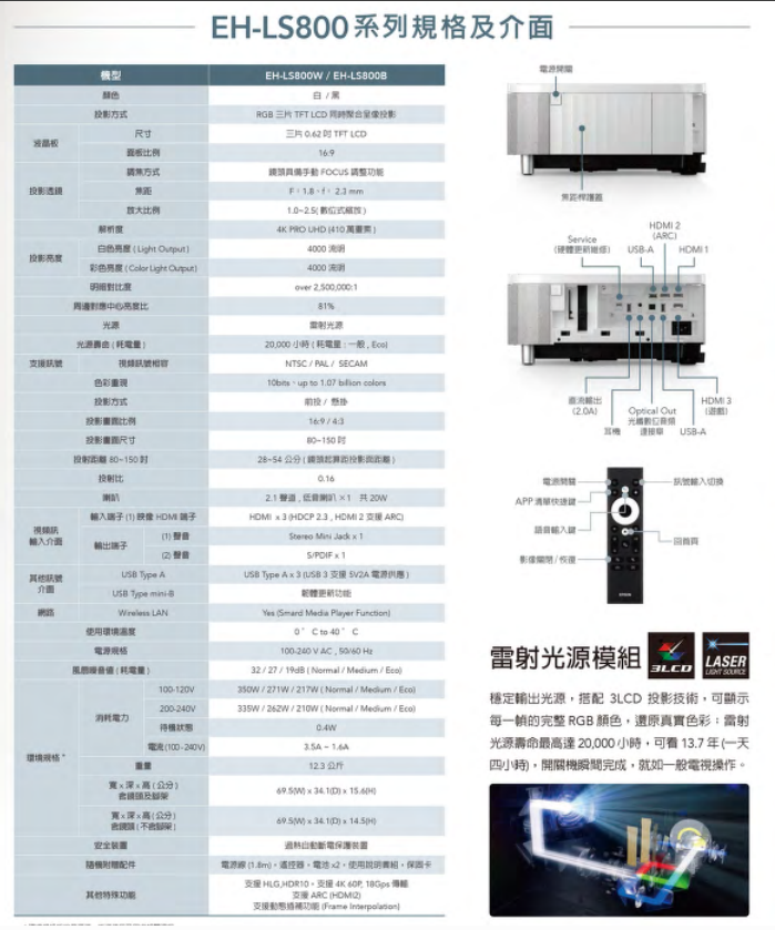 - 高色彩亮度: 4000lm彩色亮度/白色亮度