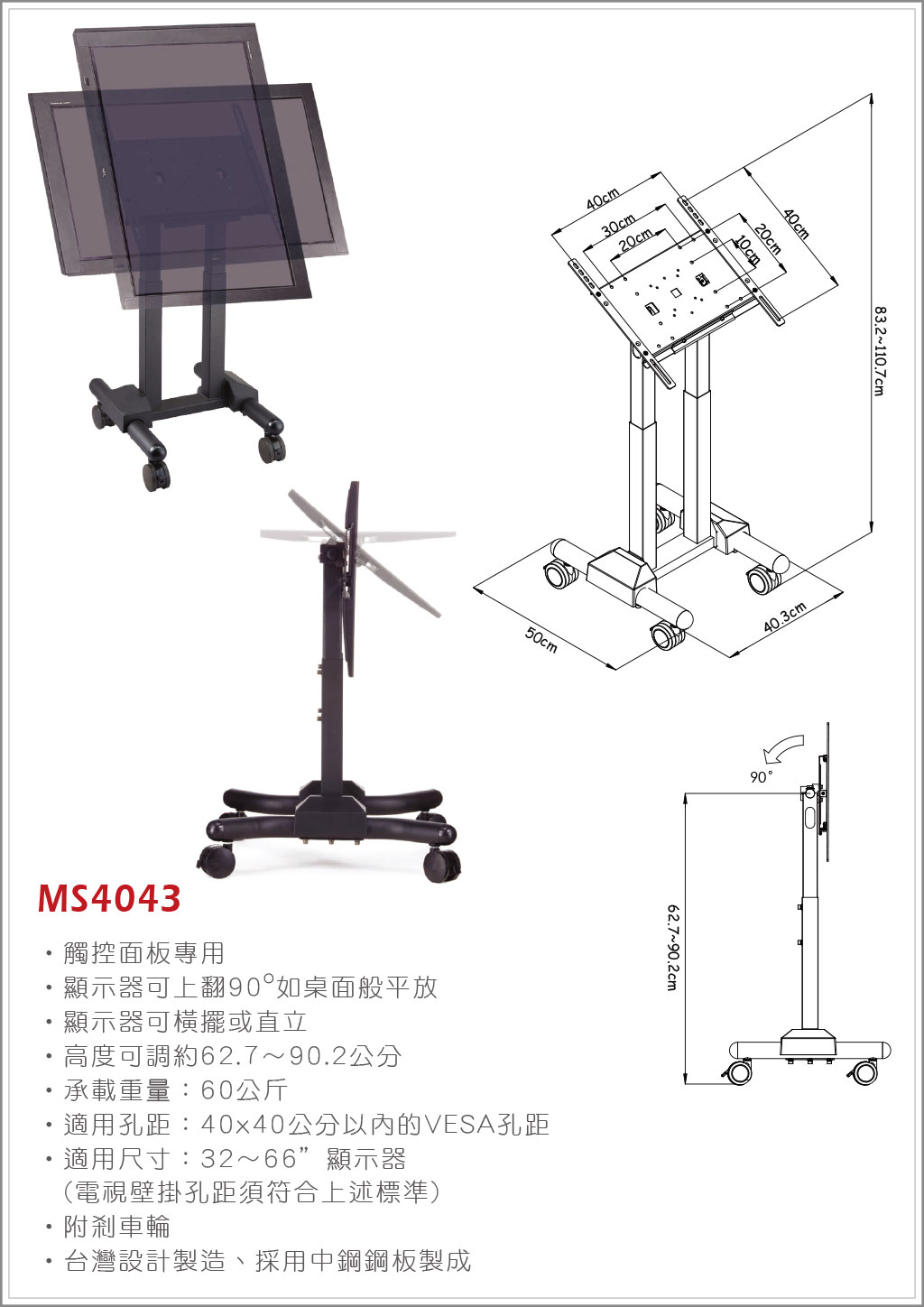MS4043顯示器移動立架 適用螢幕尺寸:32"~66"顯示器/觸控面板專用/顯示器可橫擺或直立 適用孔距40x40CM以內的VESA孔距 承載重量:60公斤/附殺車輪.