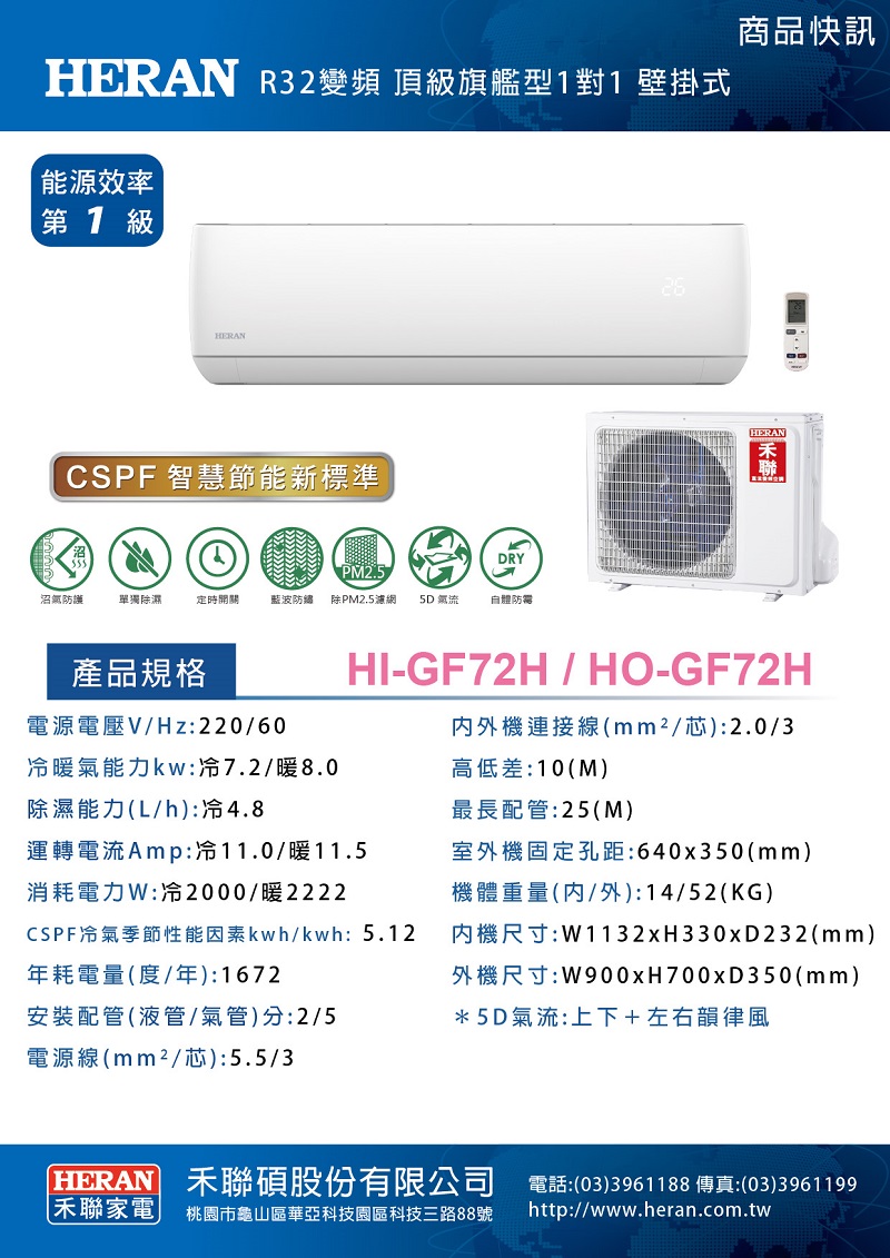 HERAN 禾聯 R32變頻一級冷暖分離式空調 HI-GF72H/HO-GF72H