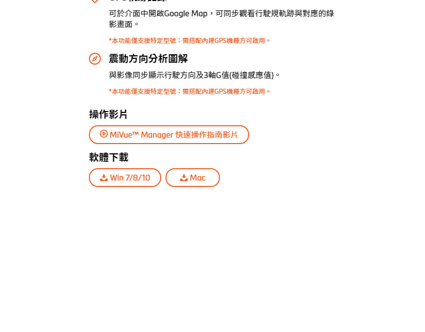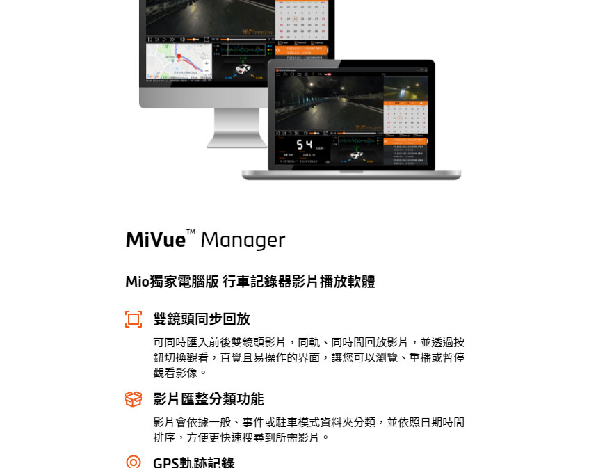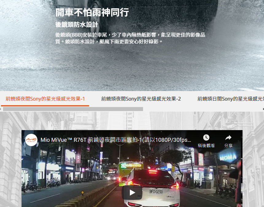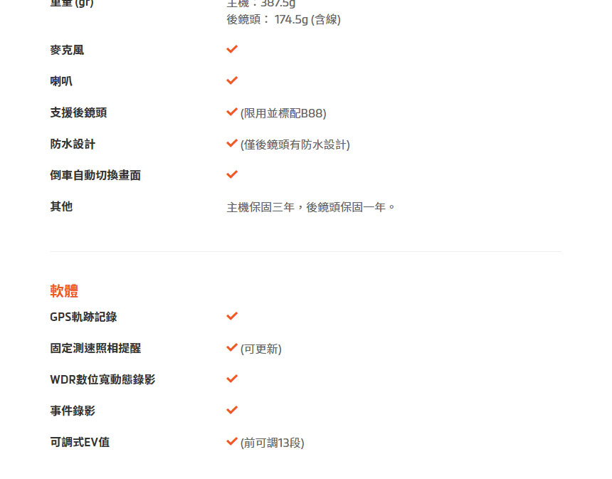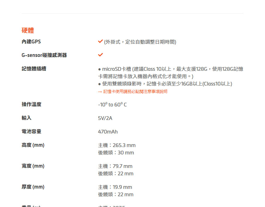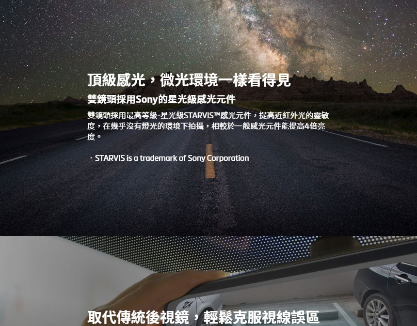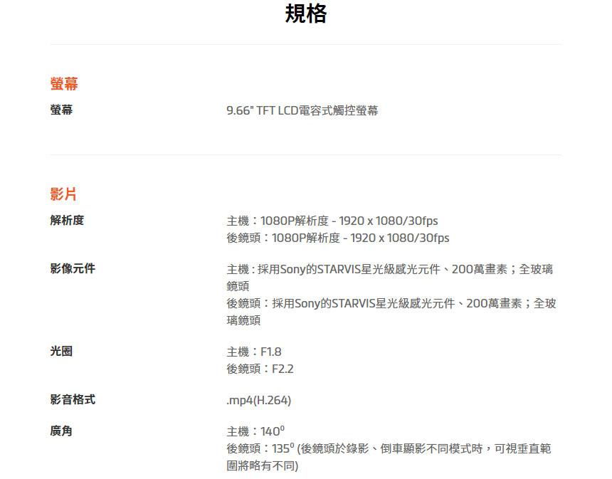 9.66” TFT LCD 電容式觸控螢幕設計 雙鏡頭STARVIS 雙鏡頭採用Sony星光級感光元件(STARVIS)/主機-F1.8大光 支援雙鏡頭同步錄影及倒車顯影/主機可調式機身設計/後鏡頭防水設計 前-1080P/30fps 後-1080P/30fps;前-140度廣