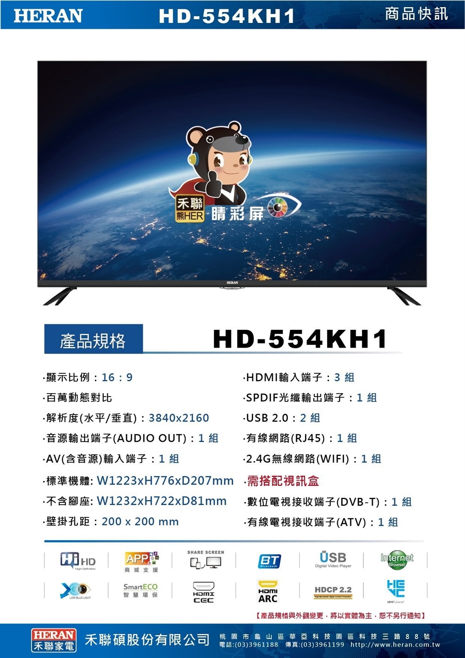 Heran禾聯 55吋 4K聯網液晶電視HD-554KH1